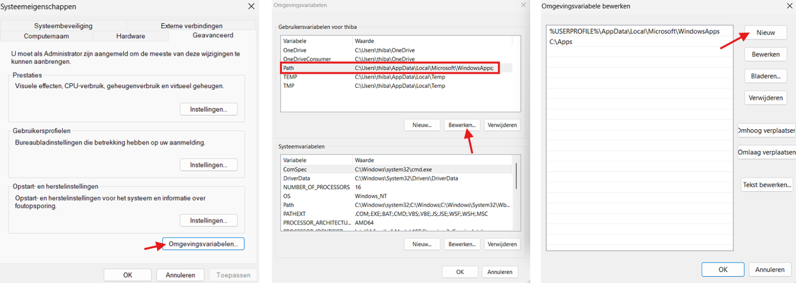 Geavanceerde systeeminstellingen > Omgevingsvariabelen > Path > Bewerken > Nieuw > Typ hier: C:\Apps